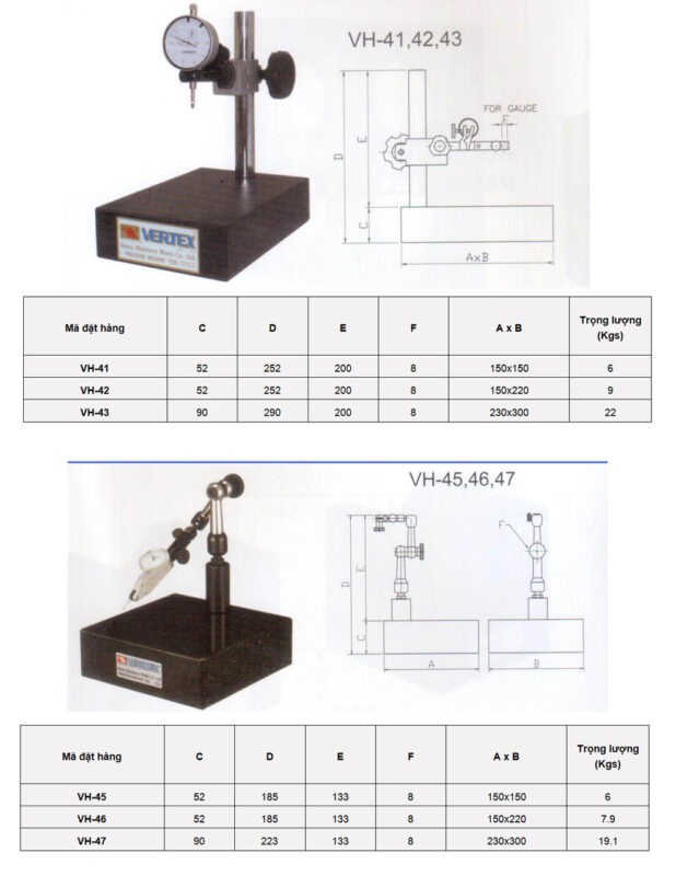 Các mã sản phẩm trên là chưa bao gồm đồng hồ so. Các mã sản phẩm VH-41, VH-42, VH-43 lắp phù hợp với đồng hồ so mã VDI-1; Các mã sản phẩm VH-45, VH-46, VH-47 lắp phù hợp với đồng hồ so VDI-0.8A.
