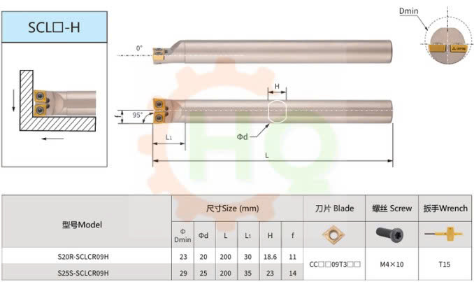 _ Cán dao tiện lỗ mã SCLC gắn 2 mảnh của HQ là dụng cụ cắt gọt kim loại được sử dụng phổ biến trong gia công cơ khí. Loại cán dao này có góc tiếp xúc mũi dao 95 độ dùng cho tiện lỗ. Với 2 mảnh cùng gắn lên cán dao giúp quá trình gia công nhanh hơn, chính xác hơn.