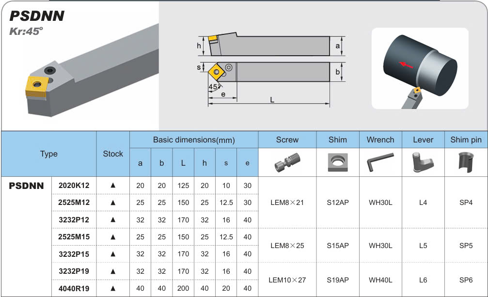 _ Cán dao tiện ngoài PSDNN của hãng ZCCCT là dụng cụ cắt gọt kim loại được sử dụng phổ biến trong gia công cơ khí. Loại cán dao này có góc tiếp xúc mũi dao 45 độ dùng cho tiện ngoài.