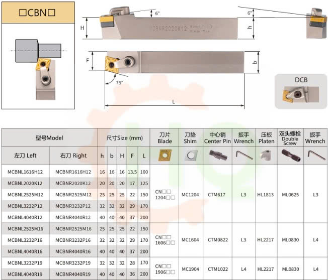 _ Cán dao tiện ngoài MCBNR/L của HQ là dụng cụ cắt gọt kim loại được sử dụng phổ biến trong gia công cơ khí. Loại cán dao này có góc tiếp xúc mũi dao 75 độ dùng cho tiện ngoài.