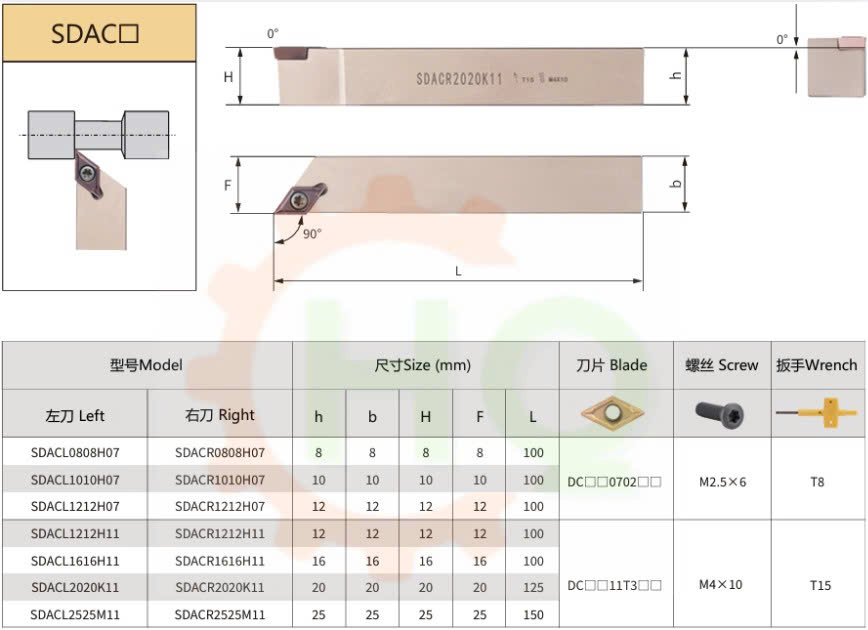 _ Cán dao tiện ngoài SDAC của HQ là dụng cụ cắt gọt kim loại được sử dụng phổ biến trong gia công cơ khí. Loại cán dao này có góc tiếp xúc mũi dao 90 độ dùng cho tiện ngoài.