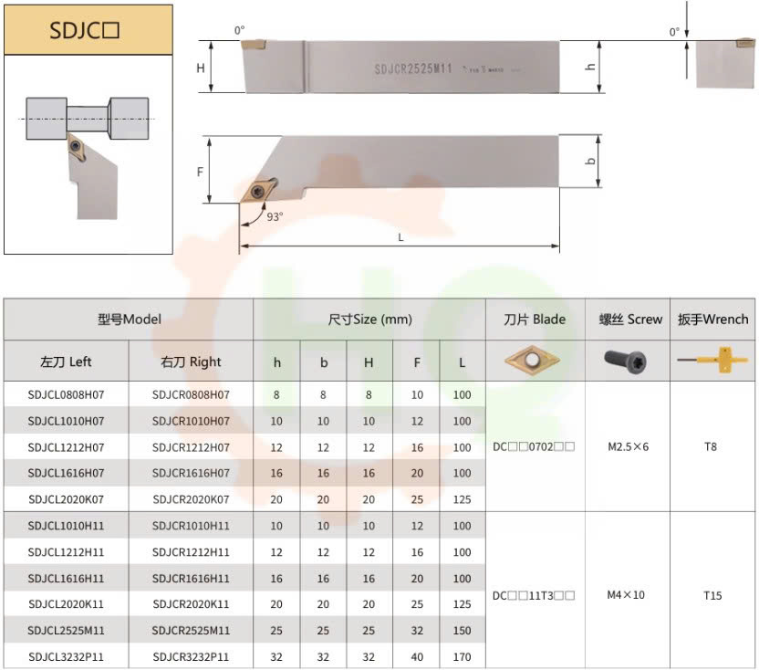 _ Cán dao tiện ngoài SDJC của HQ là dụng cụ cắt gọt kim loại được sử dụng phổ biến trong gia công cơ khí. Loại cán dao này có góc tiếp xúc mũi dao 93 độ dùng cho tiện ngoài.