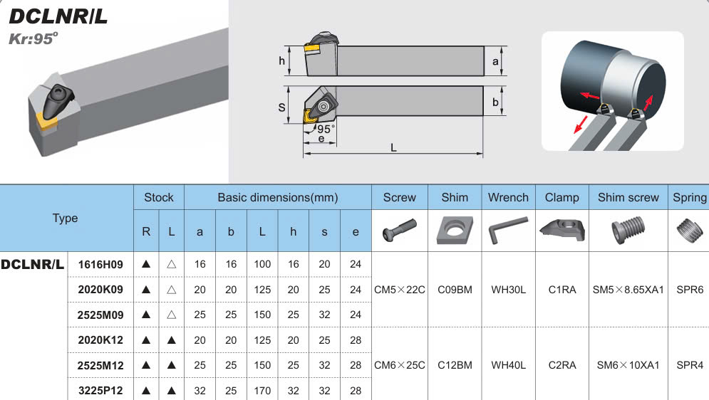 _ Cán dao tiện ngoài DCLNR/L của hãng ZCCCT là dụng cụ cắt gọt kim loại được sử dụng phổ biến trong gia công cơ khí. Loại cán dao này có góc tiếp xúc mũi dao 95 độ dùng cho tiện ngoài thẳng và tiện mặt đầu.