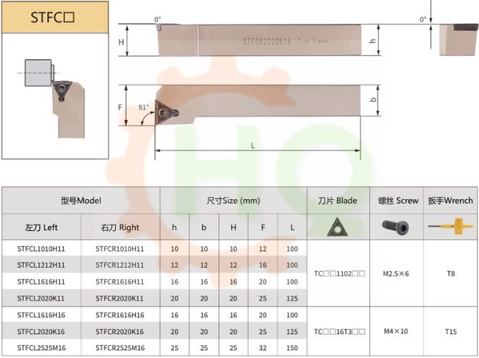 _ Cán dao tiện ngoài STFC của HQ là dụng cụ cắt gọt kim loại được sử dụng phổ biến trong gia công cơ khí. Loại cán dao này có góc tiếp xúc mũi dao 91 độ dùng cho tiện ngoài, mặt đầu