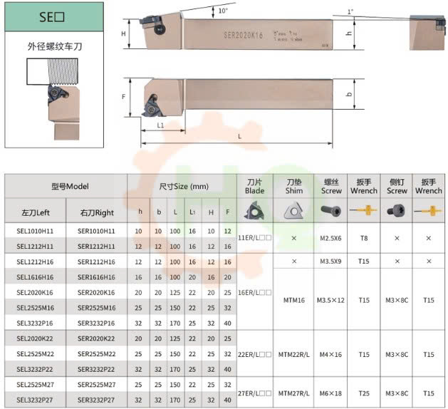 Thông số kỹ thuật của cán dao tiện ren SER/SEL