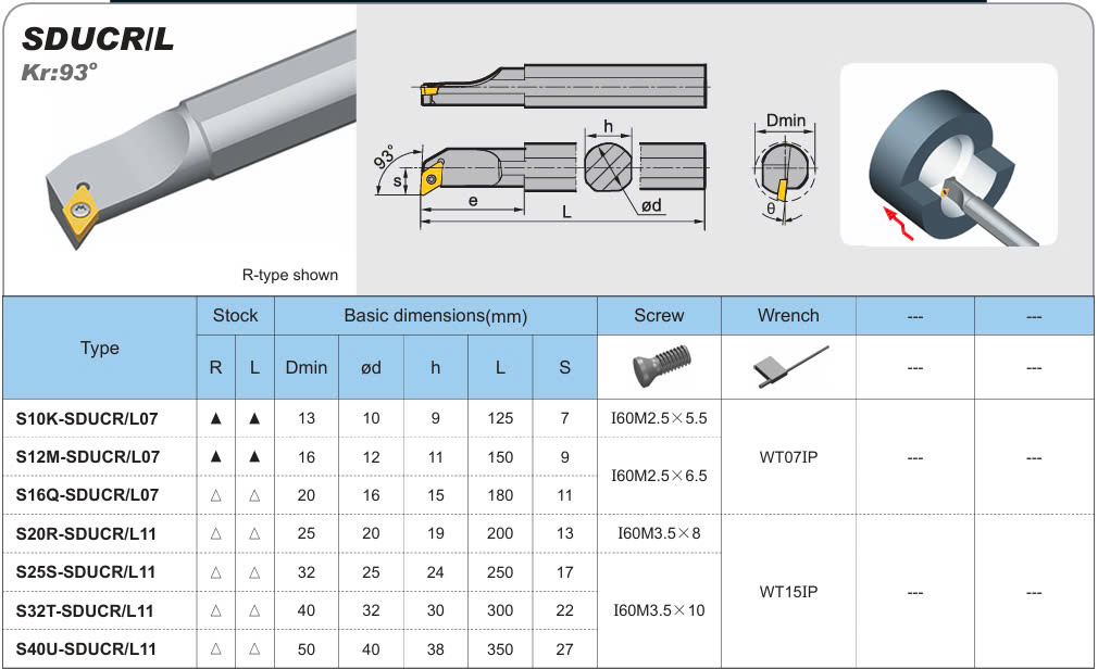 _Cán dao tiện lỗ SDUCR/L gồm có cán trái SDUCL và cán phải SDUCR phù hợp với yêu cầu gia công.
