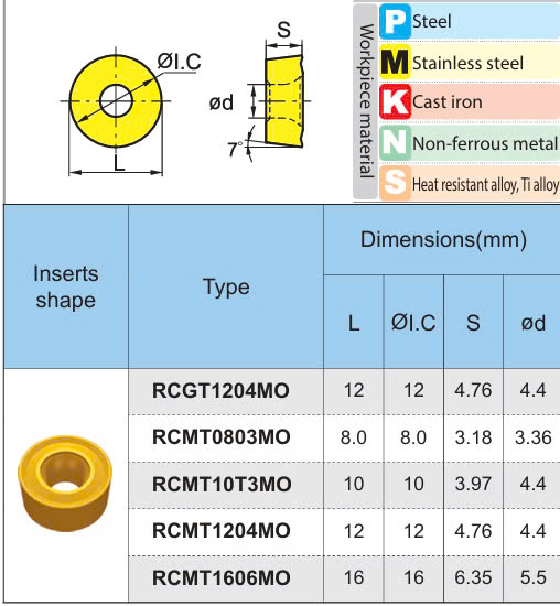 1. Mảnh dao tiện RCMT là một loại mảnh dao được sử dụng cho dao tiện trong các ứng dụng gia công tiện biên dạng tròn. Được lắp với cán dao có mã: SRDCN, SRGCR/L. Đặc điểm chung của loại mảnh này bao gồm: