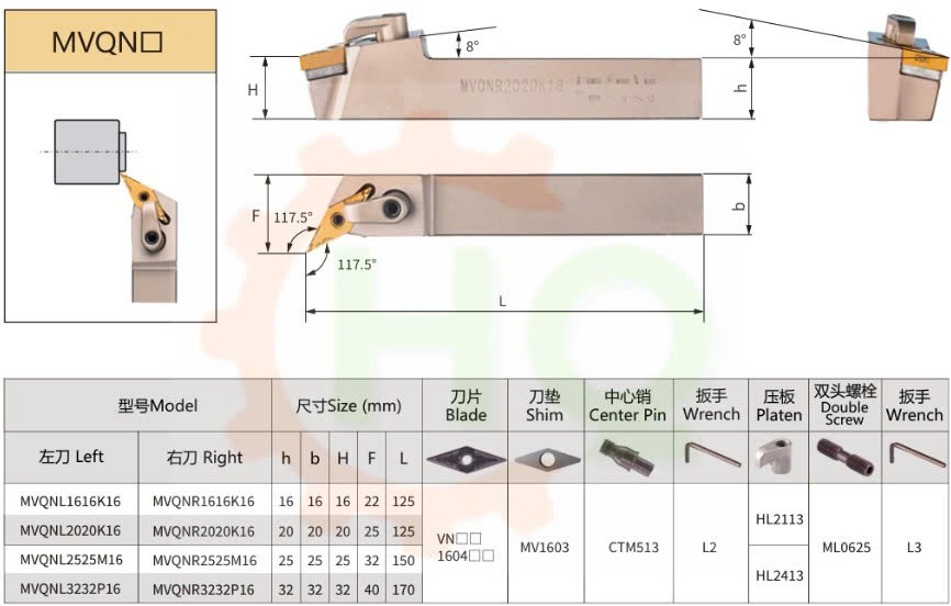 _ Cán dao tiện MVQN của HQ là dụng cụ cắt gọt kim loại được sử dụng phổ biến trong gia công cơ khí. Loại cán dao này có góc tiếp xúc mũi dao 117,5 độ dùng cho tiện ngoài, mặt đầu
