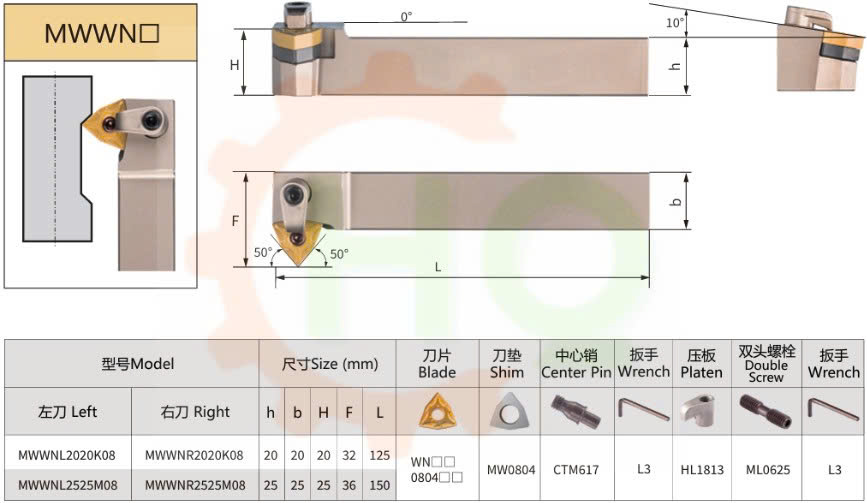 _ Cán dao tiện MWWN của HQ là dụng cụ cắt gọt kim loại được sử dụng phổ biến trong gia công cơ khí. Loại cán dao này có góc tiếp xúc mũi dao 50 độ dùng cho tiện rãnh mặt đầu