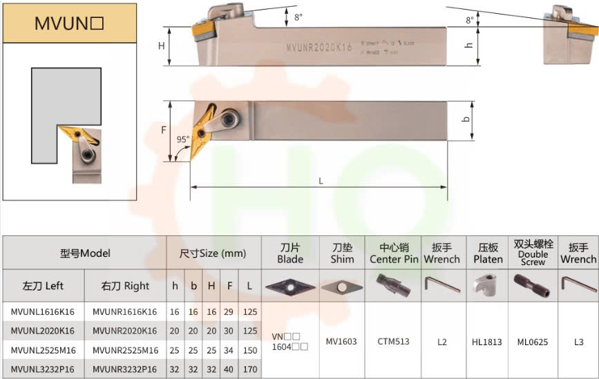 _ Cán dao tiện MVUN của HQ là dụng cụ cắt gọt kim loại được sử dụng phổ biến trong gia công cơ khí. Loại cán dao này có góc tiếp xúc mũi dao 95 độ dùng cho tiện mặt đầu