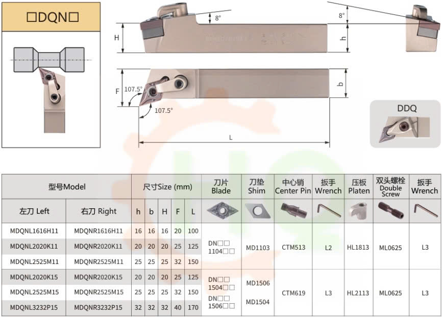 _ Cán dao tiện ngoài MDQN, DDQN của HQ là dụng cụ cắt gọt kim loại được sử dụng phổ biến trong gia công cơ khí. Loại cán dao này có góc tiếp xúc mũi dao 107.5 độ dùng cho tiện ngoài.
