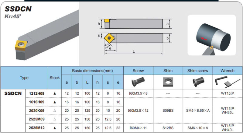 _ Cán dao tiện ngoài SSDCN của hãng ZCCCT là dụng cụ cắt gọt kim loại được sử dụng phổ biến trong gia công cơ khí. Loại cán dao này có góc tiếp xúc mũi dao 45 độ dùng cho tiện ngoài.