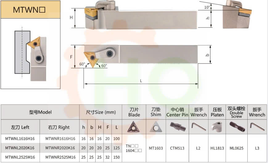 _ Cán dao tiện MTWN của HQ là dụng cụ cắt gọt kim loại được sử dụng phổ biến trong gia công cơ khí. Loại cán dao này có góc tiếp xúc mũi dao 60 độ dùng cho tiện rãnh mặt đầu
