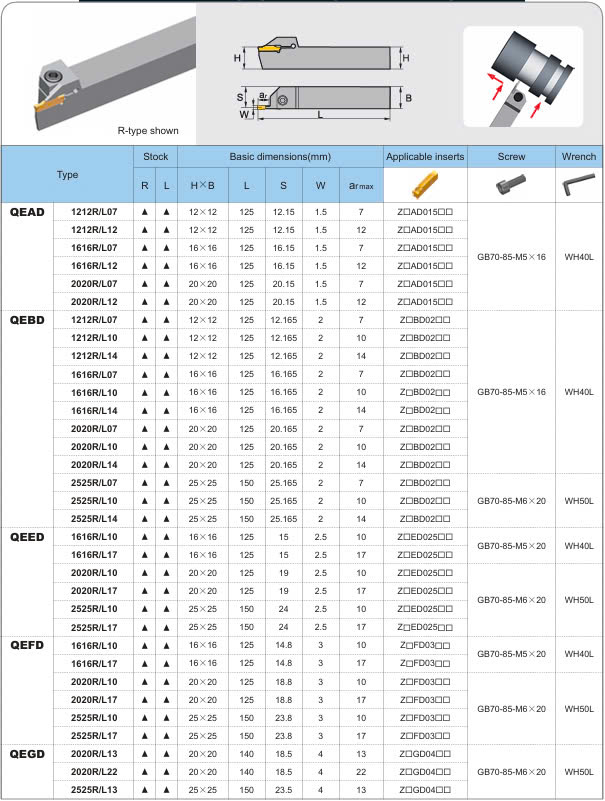 _Cán dao tiện rãnh và cắt đứt gồm có cán trái QEADL, QEBDL…, cán phải QEADR, QEBDR… và cán có lưỡi cắt ở giữa QEHS… phù hợp với yêu cầu gia công.