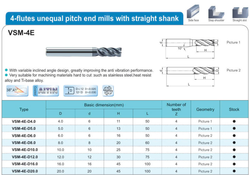 1. Dao phay 4 me cho Inox và vật liệu cứng mã VSM-4E hãng ZCCCT là dòng sản phẩm nổi bật, được dùng phổ biến trong gia công cơ khí. Nhờ những tính năng như là khả năng chống rung tốt nên thích hợp phay rãnh, góc vuông và bề mặt cạnh đối với vật liệu thép hợp kim cứng, thép chịu nhiệt và inox. Với lớp phủ AITiN giúp tuổi thọ của dao tốt hơn nhiều.