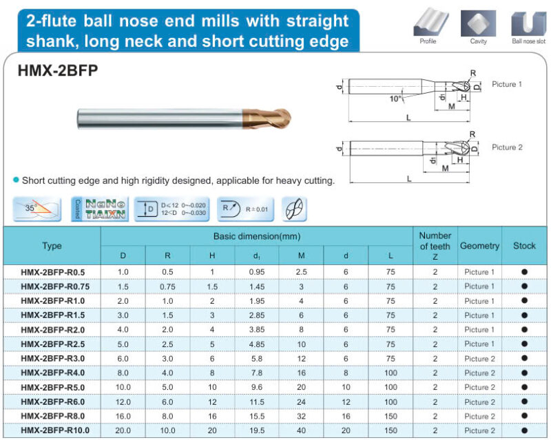 1. Dao phay cầu 2 me cổ dài cho thép ~68HRC mã HMX-2BFP hãng ZCCCT là dòng sản phẩm nổi bật, được dùng phổ biến trong gia công cơ khí. Nhờ những tính năng như là độ bền cao, tối ưu chi phí, khả năng cắt gọt chính xác và hiệu suất gia công ổn định. Với cổ dài và lưỡi cắt ngắn thích hợp phay hốc sâu, rãnh, phay biên dạng Profile tải nặng cho thép có độ cứng lên đến ~68HRC. Lớp phủ NaNo TiAIXN giúp tuổi thọ của dao tốt hơn nhiều..