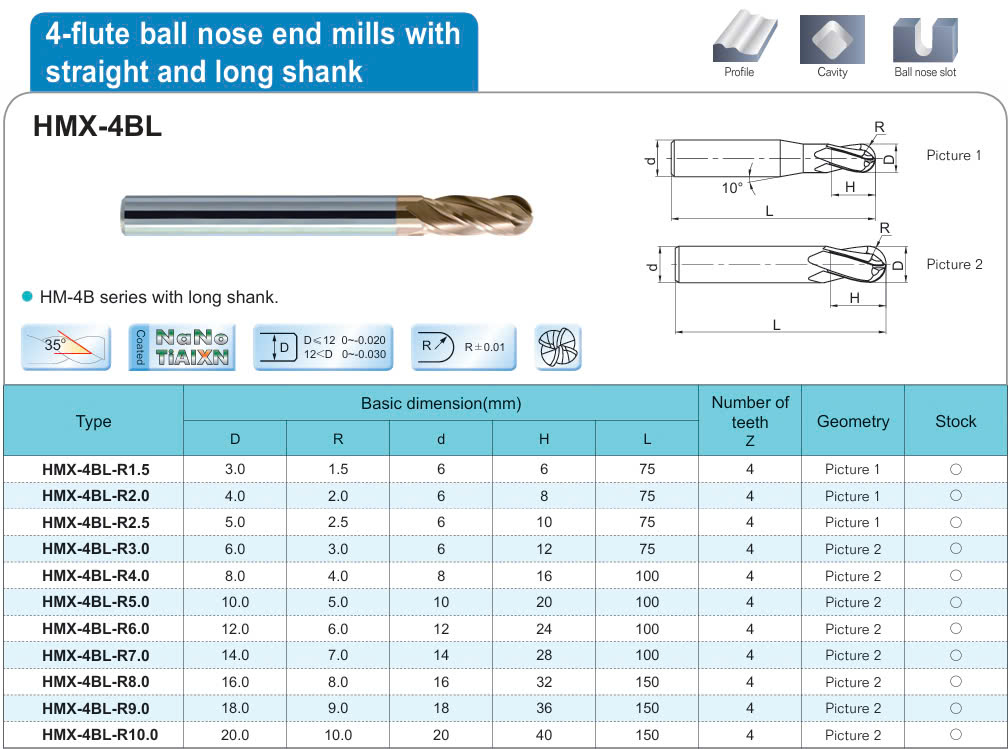 Dao phay cầu 4 me chuôi dài cho thép ~68HRC mã HMX-4BL hãng ZCCCT