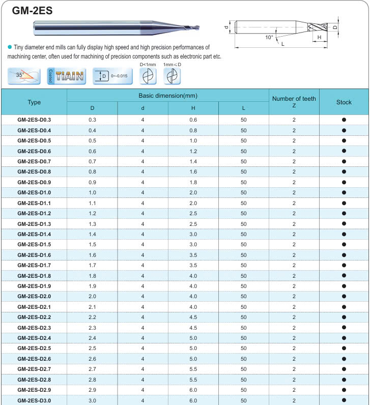 1. Dao phay ngón 2 me mã GM-2ES hãng ZCCCT là dòng sản phẩm nổi bật, được dùng phổ biến trong gia công cơ khí. Dao phay loại GM-2ES với đường kính phay siêu nhỏ giúp phay các linh kiện điện tử nhỏ chính xác. Với lớp phủ TiAIN giúp tuổi thọ của dao tốt hơn nhiều.